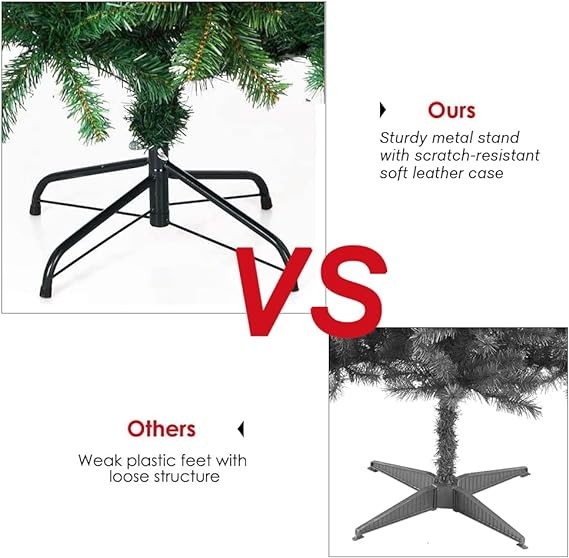 ?Sturdy metal stand—Our christmas tree uses metal stand instead of cheap plastic stand to ensure tree stand stability .And the stand have scratch-resistant soft leather case to protect floor and legs.