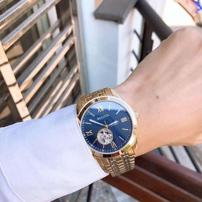 Bulova Men's Classic 3 Hand Automatic Gold Stainless Steel Watch, Blue Dial (Model:97A131)