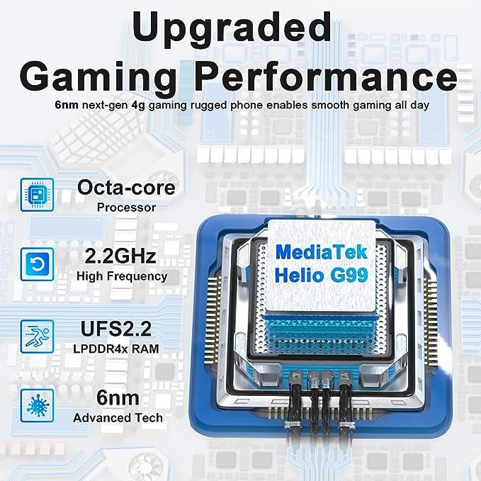 • 【Exceptionally Gaming Performance & Power Efficiency】DOOGEE S100 gaming rugged smartphone using MeidaTek Helio G99 6nm-class chip enables it to be exceptionally power efficient while in high speed gaming operation. With an octa-core (2 x Cortex A78 2.2GHz + 6 x Cortex A55 2.0GHz) CPU, LPDDR4X memory and fast UFS 2.2 storage accelerate data access, maximizing operative performance in games, apps, and everyday activities.