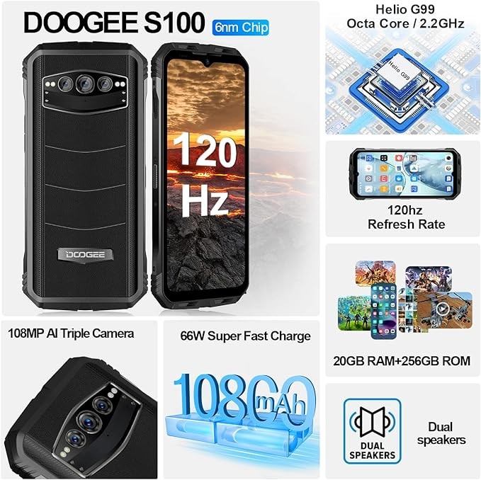 • 【6.58" FHD+ Super-fast 120Hz Displays】Dual 4G DOOGEE S100 unlocked rugged phone features 6.58" Full HD+ vivid screen, 2408*1080 high resolution, 401 PPI, 19:9 Aspect Ratio, 480nits brightness, 120Hz adaptive refresh rate display provide a supremely smooth daily using experience, with notably smoother scrolling of webpages and animations in apps. With dual Hi-Res speakers to enhance more realistic audiovisual experience