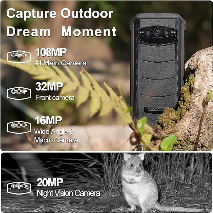 • 【108MP High-resolution & Night Vision Capturing】2023 newest DOOGEE S100 outdoor rugged phones with 108MP main camera, 32MP front-facing camera to shoot ultra-high-resolution pictures, capture ultra clear moments as memory. 20MP night vision camera to unveil the night sight. 8MP wide angle & macro camera for more sense view.