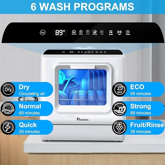 Multi-Purpose & Easy To Use: The dishwasher can not only wash dishes but also wash fruits and vegetables. Touch the screen switch to select 1 of 6 cleaning programs(DRY, Normal, Quick, ECO, Strong, Fruit), after the start, the machine will automatically run until finish the washing.