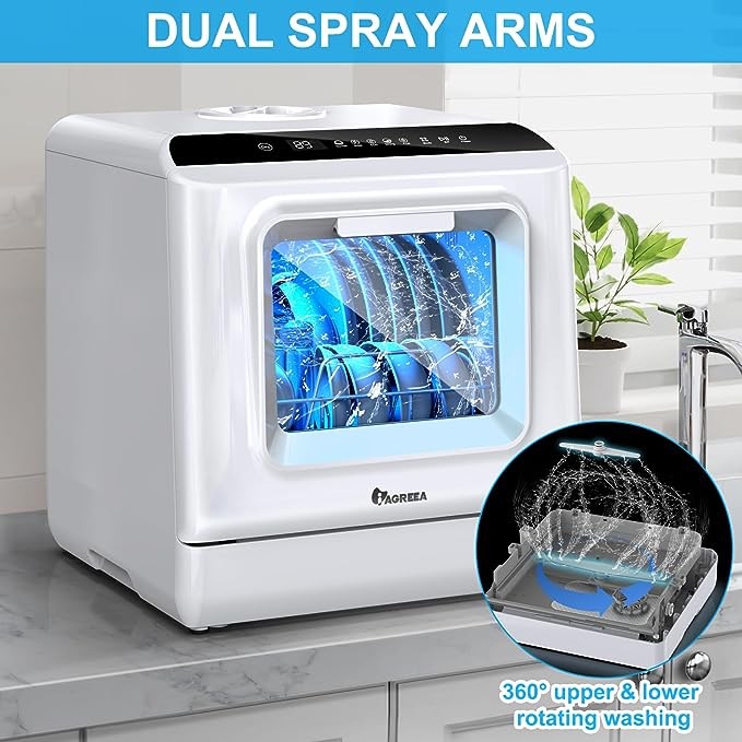 Dual Spray Arm: This mini dishwasher uses upper and lower dual spray arms and 360-degree rotating spray, the dirt of cleaning tableware to the greatest extent, you can get the shiny tableware after opening the lid.