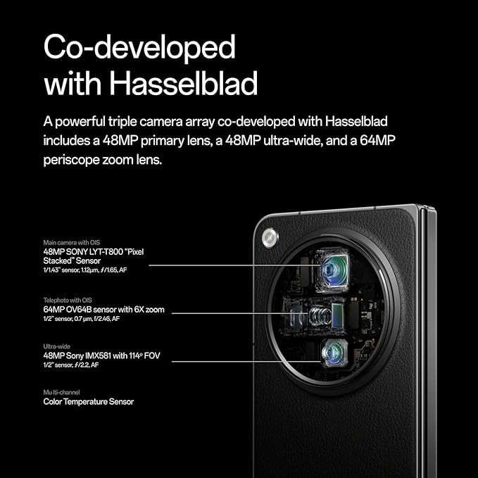 • Camera: The OnePlus Open features a powerful triple camera array co-developed with Hasselblad. These include a primary 48MP primary lens, a 48MP ultra-wide, and a 64MP periscope zoom lens. Capture pro-grade portraits with natural bokeh & high color accuracy or shoot stories in Dolby Vision HDR format.