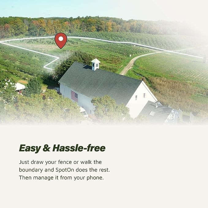 TRAVEL-FRIENDLY - CUSTOMIZE UP TO 20 FENCES - Create virtual fences of any shape or size with no acreage limits and add Keep Out Zones to off limits areas, without extra hardware or beacons. There are no buried wires or hardware to install so you can make fences at home, on the go, or if you move. SpotOn is the ONLY GPS fence to support overlapping fences, so you can create a large fence for daytime use and a smaller fence for night, or create multiple fences to support rotational grazing.